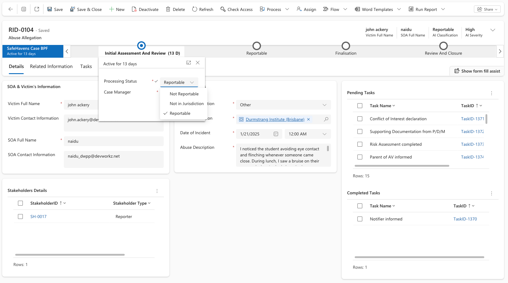 AI assessment of allegation severity helps case managers quickly evaluate the seriousness of reported incidents by analysing language, context, and historical data. It flags high-risk cases, prioritises responses, and supports consistent decision-making—ensuring timely, informed action in sensitive environments like child protection or workplace safety. AI assessments refine the classification of all allegations, automatically distinguishing between Reportable, Not Reportable, and Non-Jurisdictional cases.